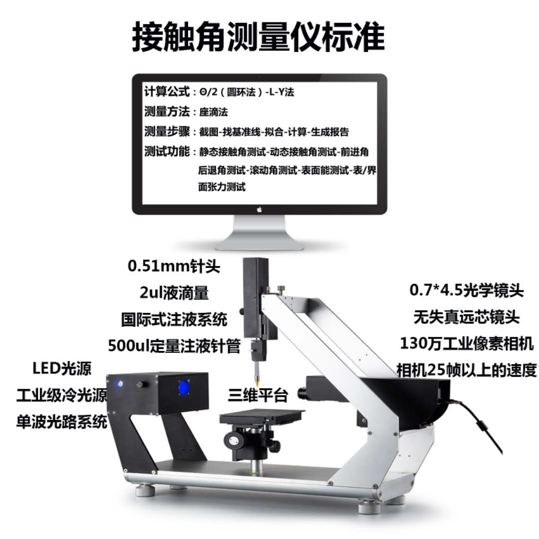 水滴角測試功能:靜態接觸角測試;動態接觸角測試;視頻接觸角測試;滾動角測試;前進角后退角測試;表面能測試;表/界面張力測試